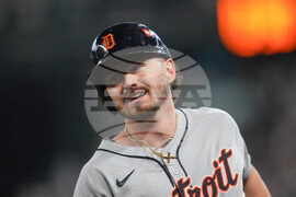 Detroit Tigers second baseman Colt Keith (33) reacts after lingint out to Seattle Mariners shortstop J.P. Crawford during the ninth inning in Game 5 of baseball's American League Division Series Friday, Oct. 10, 2025, in Seattle. (AP Photo/Lindsey Wasson)