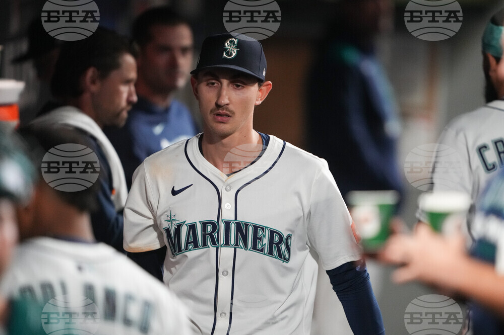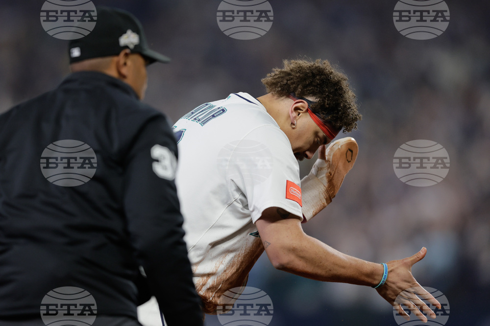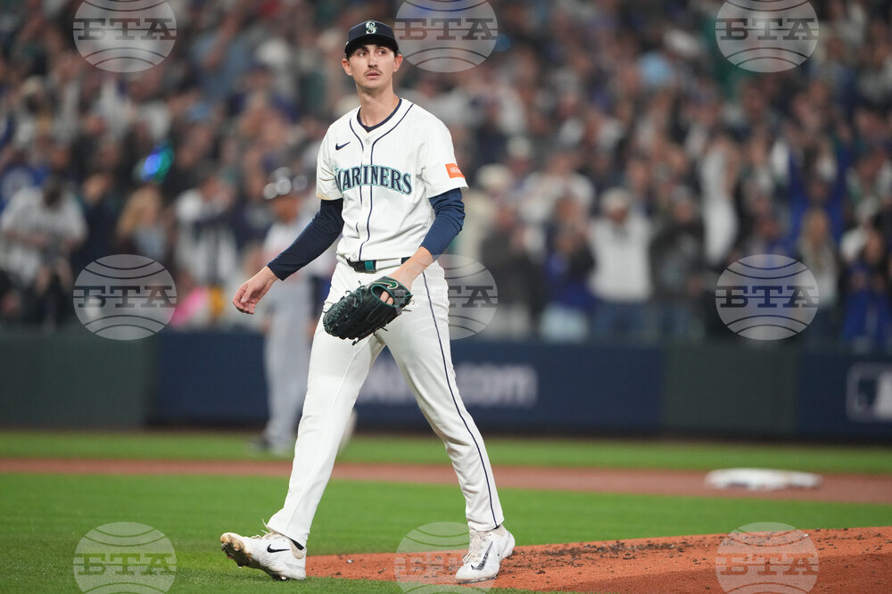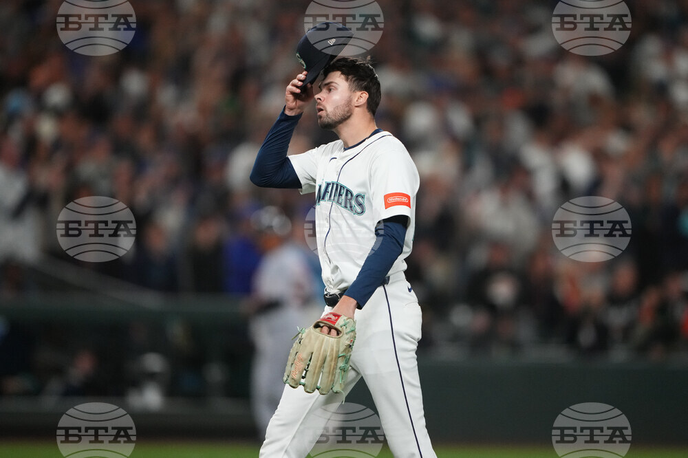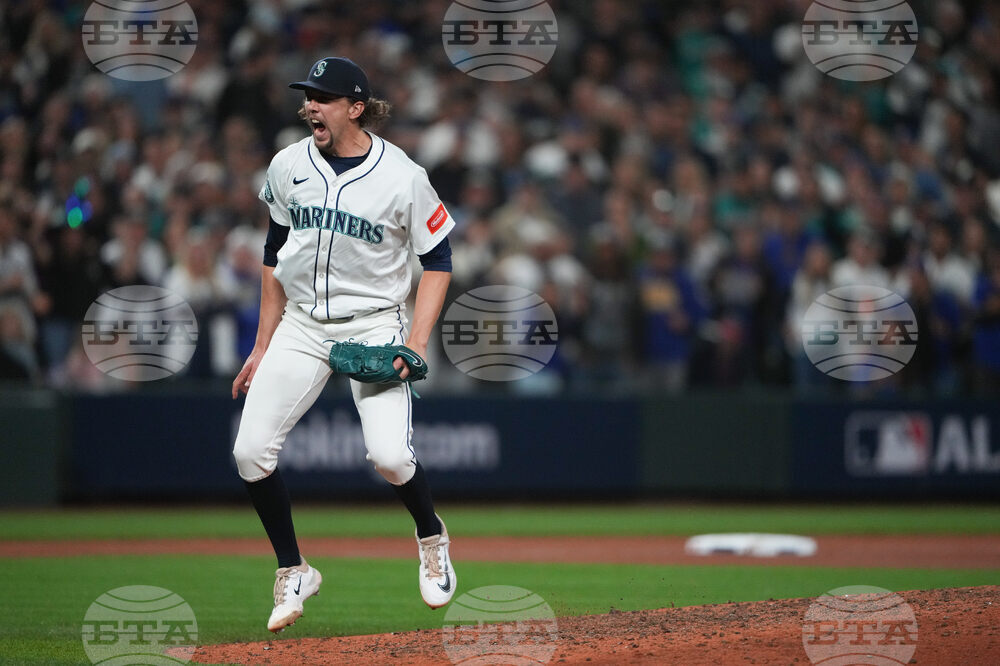 Seattle Mariners pitcher Matt Brash reacts after the top of the seventh inning in Game 5 of baseball's American League Division Series against the Detroit Tigers, Friday, Oct. 10, 2025, in Seattle. (AP Photo/Lindsey Wasson)