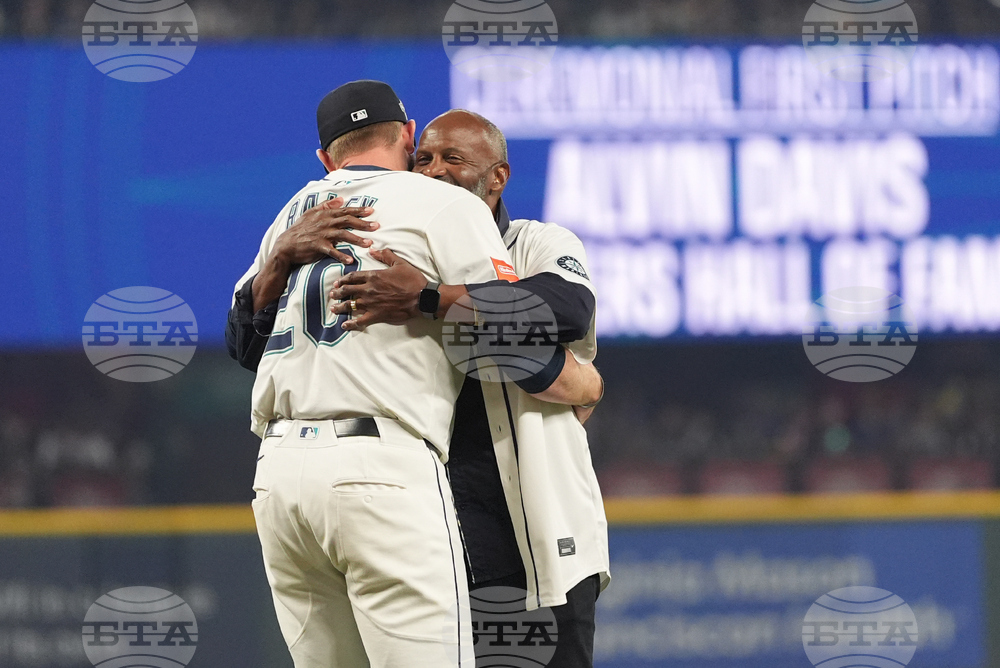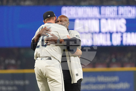 Seattle Mariners right fielder Luke Raley (20) hugs former Seattle Mariner Alvin Davis after a ceremonial first pitch before Game 5 of baseball's American League Division Series against the Detroit Tigers, Friday, Oct. 10, 2025, in Seattle. (AP Photo/Lindsey Wasson)