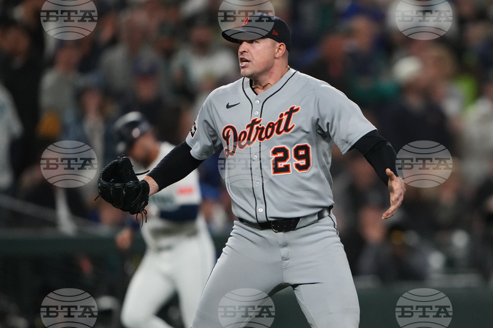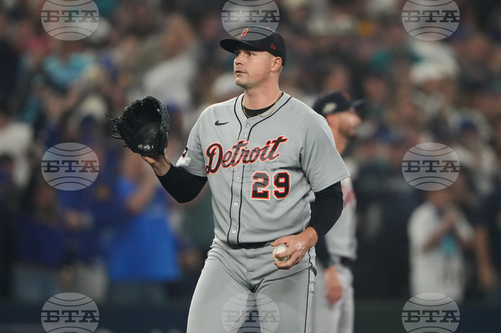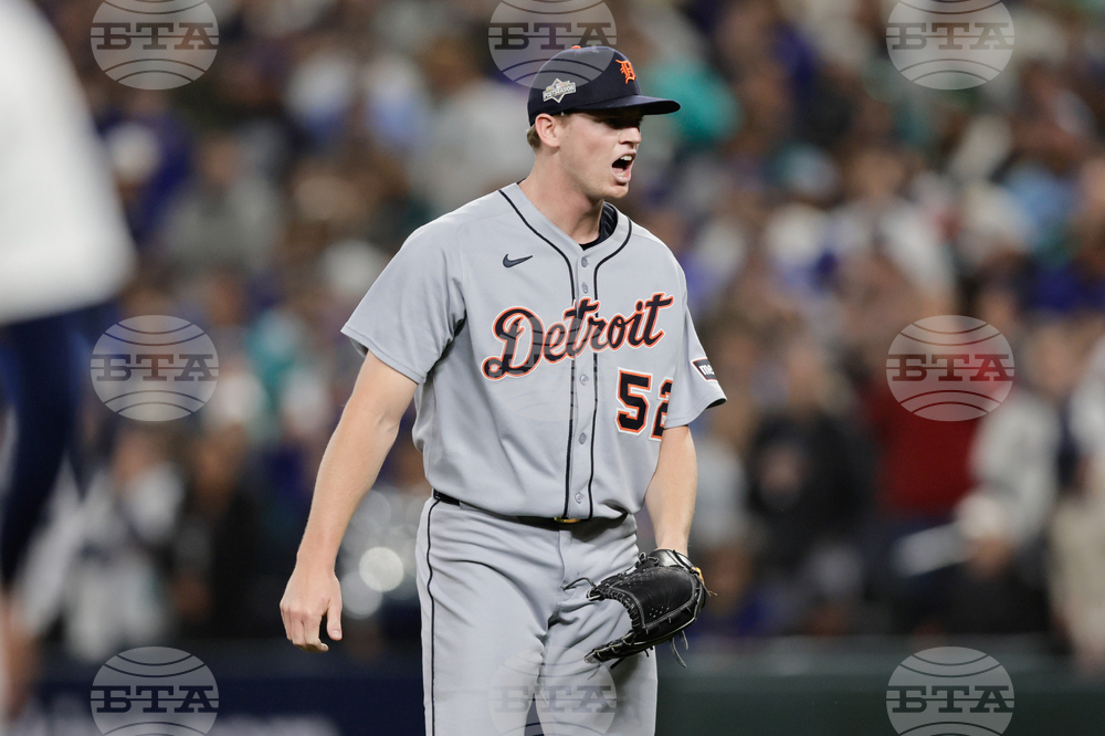 Detroit Tigers pitcher Troy Melton reacts to the third out to end the 10th inning in Game 5 of baseball's American League Division Series against the Seattle Mariners, Friday, Oct. 10, 2025, in Seattle. (AP Photo/John Froschauer)