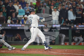 Seattle Mariners second baseman Leo Rivas hits an RBI-single to bring in second baseman Jorge Polanco during the seventh inning in Game 5 of baseball's American League Division Series against the Detroit Tigers, Friday, Oct. 10, 2025, in Seattle. (AP Photo/John Froschauer)