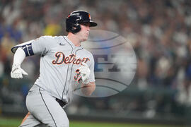 Detroit Tigers right fielder Kerry Carpenter runs the bases after hitting a two run home run during the sixth inning in Game 5 of baseball's American League Division Series against the Seattle Mariners, Friday, Oct. 10, 2025, in Seattle. (AP Photo/John Froschauer)