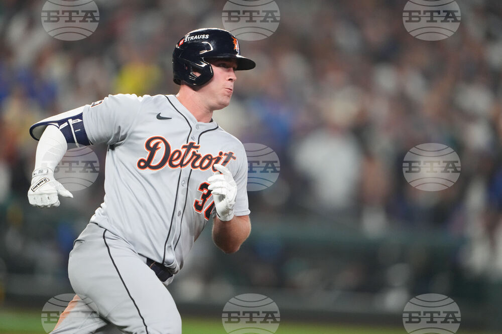 Detroit Tigers right fielder Kerry Carpenter runs out a single during the third inning in Game 5 of baseball's American League Division Series against the Seattle Mariners, Friday, Oct. 10, 2025, in Seattle. (AP Photo/Lindsey Wasson)