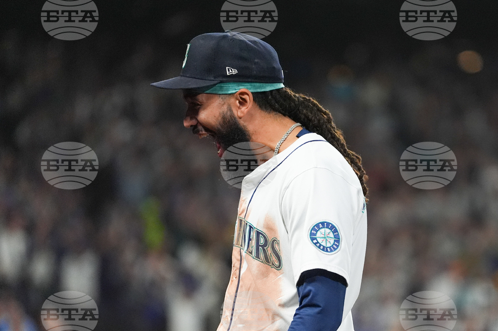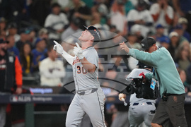 Seattle Mariners shortstop J.P. Crawford after a replay review ruled that he tagged out Detroit Tigers second baseman Colt Keith trying to steal second base during the fourth inning in Game 5 of baseball's American League Division Series Friday, Oct. 10, 2025, in Seattle. (AP Photo/Lindsey Wasson)
