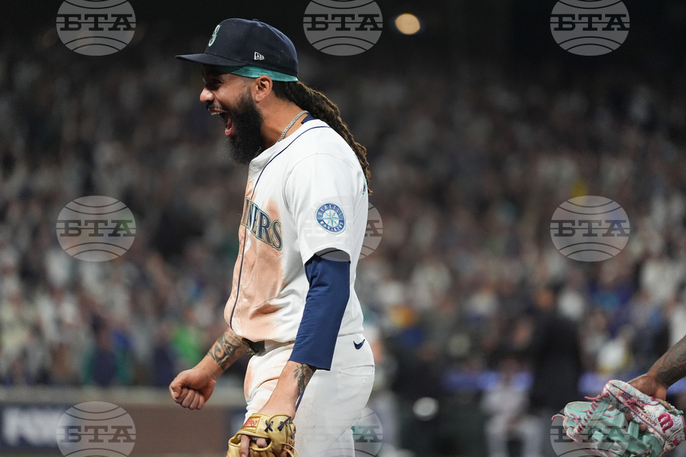 Seattle Mariners pitcher Andrés Muñoz reacts after striking out Detroit Tigers third baseman Zach McKinstry to bring it to the bottom of the ninth inning in Game 5 of baseball's American League Division Series Friday, Oct. 10, 2025, in Seattle. (AP Photo/Lindsey Wasson)
