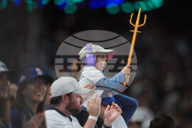 Fans celebrate after Seattle Mariners first baseman Josh Naylor hit a double during the second inning in Game 5 of baseball's American League Division Series against the Detroit Tigers, Friday, Oct. 10, 2025, in Seattle. (AP Photo/Lindsey Wasson)