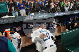 Seattle Mariners first baseman Josh Naylor celebrates in the dugout after he scored on a sacrifice fly by Mitch Garver during the second inning in Game 5 of baseball's American League Division Series against the Detroit Tigers, Friday, Oct. 10, 2025, in Seattle. (AP Photo/Lindsey Wasson)