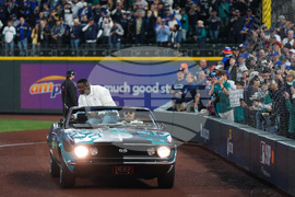 Former Seattle Mariners Ken Griffey Jr. is driven on to the field before Game 5 of baseball's American League Division Series between the Seattle Mariners and the Detroit Tigers, Friday, Oct. 10, 2025, in Seattle. (AP Photo/Lindsey Wasson)
