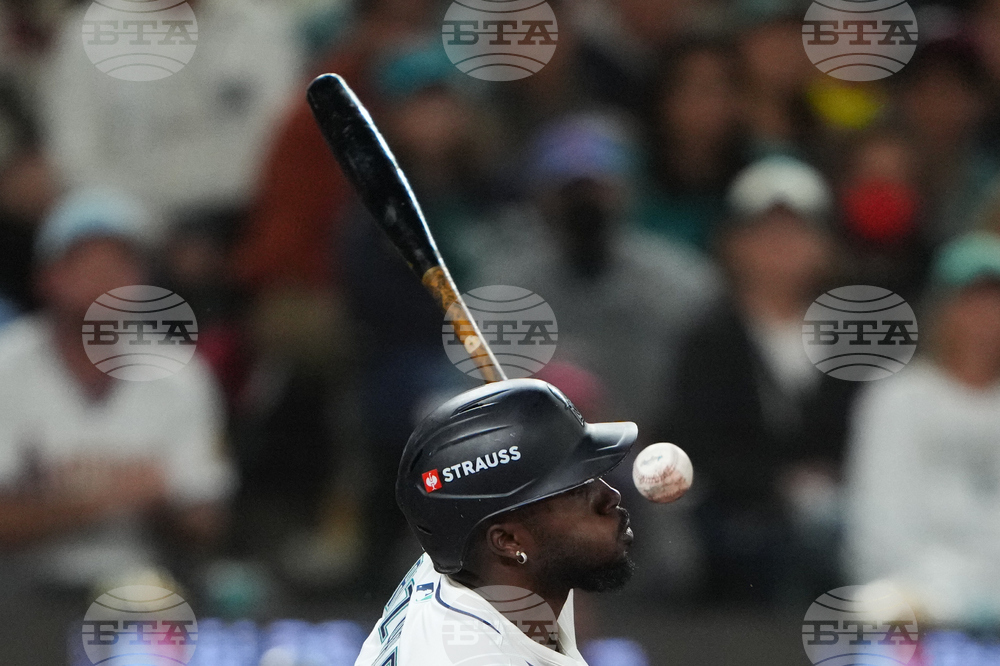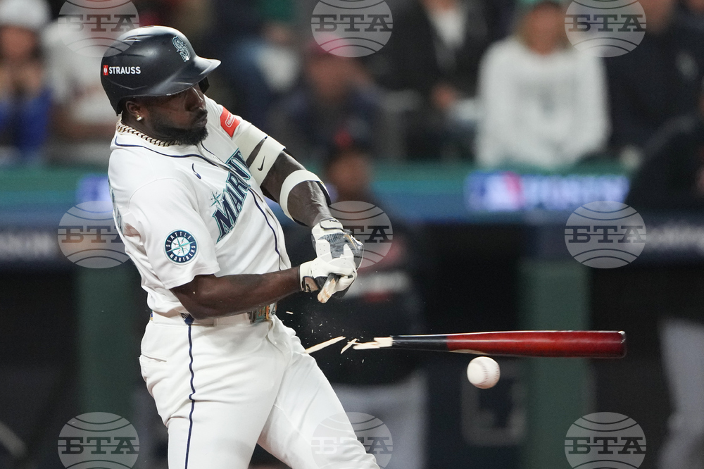 Seattle Mariners left fielder Randy Arozarena's bat breaks during the third inning in Game 5 of baseball's American League Division Series against the Detroit Tigers, Friday, Oct. 10, 2025, in Seattle. (AP Photo/Lindsey Wasson)