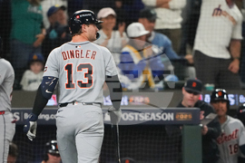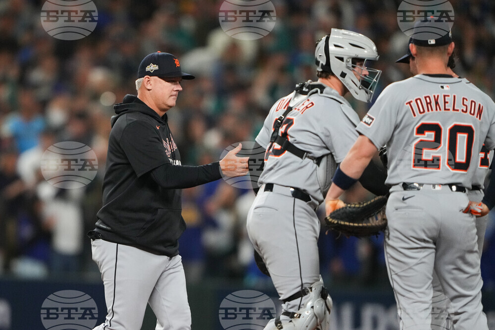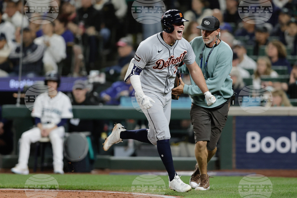 Detroit Tigers right fielder Kerry Carpenter is walked during the eighth inning in Game 5 of baseball's American League Division Series against the Seattle Mariners, Friday, Oct. 10, 2025, in Seattle. (AP Photo/Lindsey Wasson)
