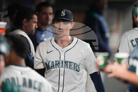 Seattle Mariners pitcher George Kirby walks in the dugout after being pulled during the sixth inning in Game 5 of baseball's American League Division Series against the Detroit Tigers, Friday, Oct. 10, 2025, in Seattle. (AP Photo/Lindsey Wasson)