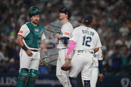 Seattle Mariners pitcher Logan Gilbert, left, talks with Seattle Mariners catcher Cal Raleigh during the 11th inning in Game 5 of baseball's American League Division Series against the Detroit Tigers, Friday, Oct. 10, 2025, in Seattle. (AP Photo/Lindsey Wasson)