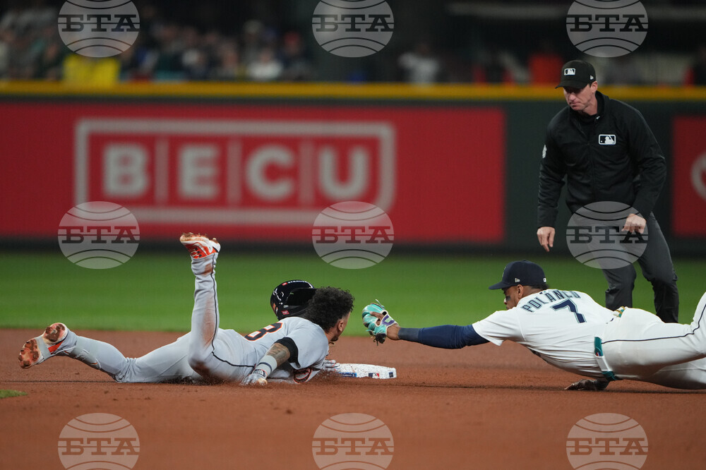 Seattle Mariners shortstop J.P. Crawford (3) tags out Detroit Tigers second baseman Colt Keith (33) as he tries to steal second base during the fourth inning in Game 5 of baseball's American League Division Series Friday, Oct. 10, 2025, in Seattle. (AP Photo/Lindsey Wasson)