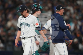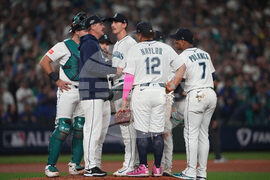 Seattle Mariners catcher Cal Raleigh, left, and first baseman Josh Naylor (12) react as Seattle Mariners manager Dan Wilson walks out to pull pitcher George Kirby, center, during the sixth inning in Game 5 of baseball's American League Division Series against the Detroit Tigers, Friday, Oct. 10, 2025, in Seattle. (AP Photo/Lindsey Wasson)