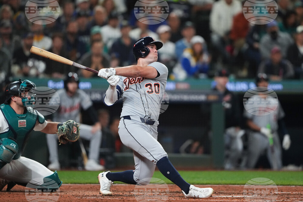 Detroit Tigers right fielder Kerry Carpenter (30) hits a two run home run during the sixth inning in Game 5 of baseball's American League Division Series against the Seattle Mariners, Friday, Oct. 10, 2025, in Seattle. (AP Photo/Lindsey Wasson)