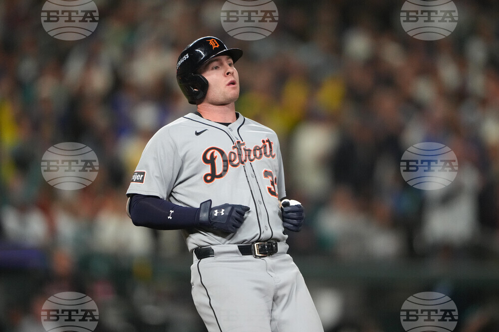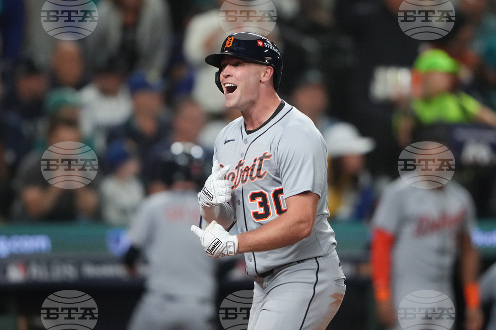 Detroit Tigers right fielder Kerry Carpenter reacts after hitting a single during the 11th inning in Game 5 of baseball's American League Division Series against the Seattle Mariners, Friday, Oct. 10, 2025, in Seattle. (AP Photo/Lindsey Wasson)