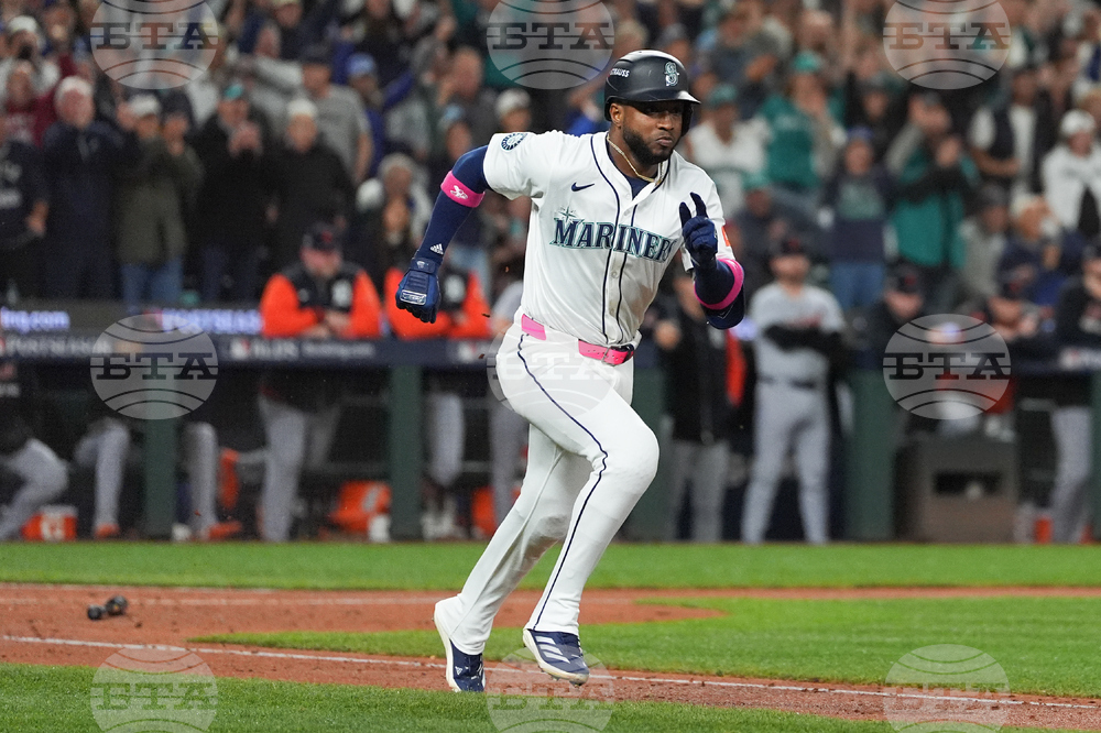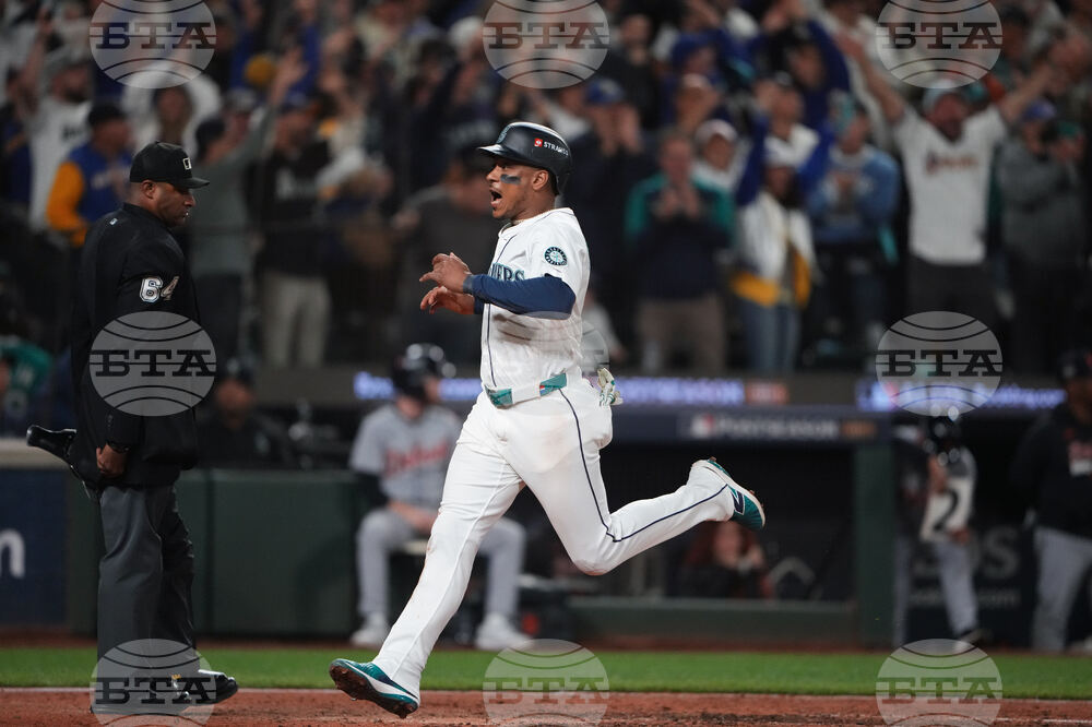 Seattle Mariners second baseman Jorge Polanco scores on an RBI-single hit by second baseman Leo Rivas during the seventh inning in Game 5 of baseball's American League Division Series against the Detroit Tigers, Friday, Oct. 10, 2025, in Seattle. (AP Photo/Lindsey Wasson)