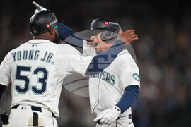 Seattle Mariners right fielder Victor Robles, left, greets Josh Naylor after he scored on a sacrifice fly by Mitch Garver during the second inning in Game 5 of baseball's American League Division Series against the Detroit Tigers, Friday, Oct. 10, 2025, in Seattle.(AP Photo/Lindsey Wasson)
