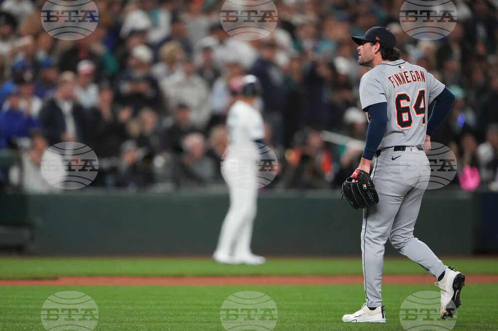 Detroit Tigers pitcher Kyle Finnegan looks on after being relieved during the seventh inning in Game 5 of baseball's American League Division Series against the Seattle Mariners, Friday, Oct. 10, 2025, in Seattle. (AP Photo/Lindsey Wasson)