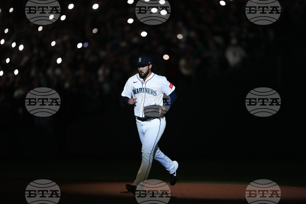 Seattle Mariners pitcher Andrés Muñoz runs on to the field during the eighth inning in Game 5 of baseball's American League Division Series against the Detroit Tigers, Friday, Oct. 10, 2025, in Seattle. (AP Photo/Lindsey Wasson)