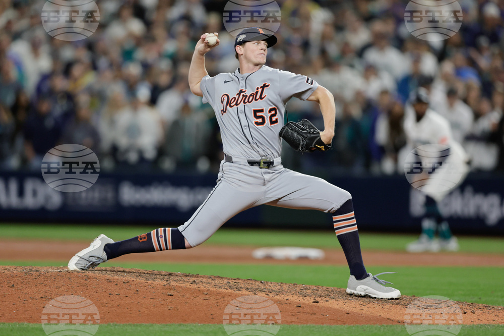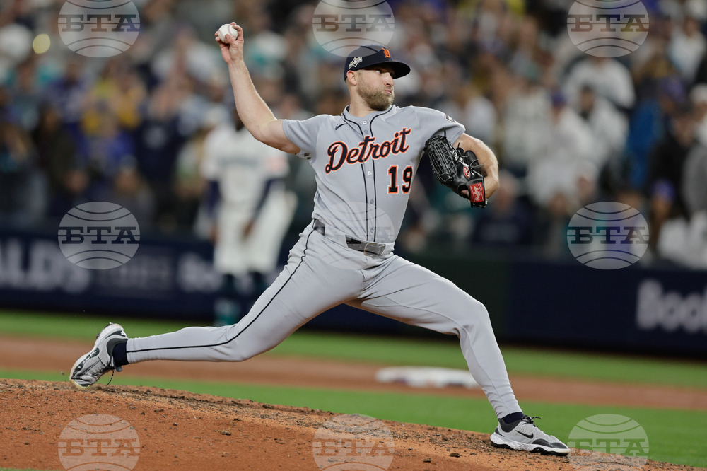 Detroit Tigers pitcher Will Vest throws during the eighth inning in Game 5 of baseball's American League Division Series against the Seattle Mariners, Friday, Oct. 10, 2025, in Seattle. (AP Photo/John Froschauer)