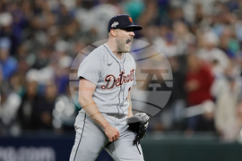 Detroit Tigers pitcher Will Vest reacts after striking out Seattle Mariners second baseman Leo Rivas for the third out of the ninth inning in Game 5 of baseball's American League Division Series Friday, Oct. 10, 2025, in Seattle. (AP Photo/John Froschauer)