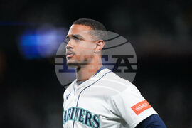 Seattle Mariners center fielder Julio Rodríguez reacts after the end of the 10th inning in Game 5 of baseball's American League Division Series against the Detroit Tigers, Friday, Oct. 10, 2025, in Seattle. (AP Photo/Lindsey Wasson)