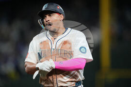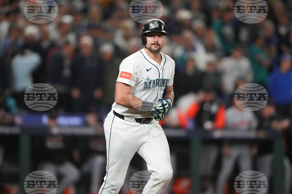 Seattle Mariners first baseman Josh Naylor, right, reacts after hitting a single during the ninth inning in Game 5 of baseball's American League Division Series against the Detroit Tigers, Friday, Oct. 10, 2025, in Seattle. (AP Photo/Lindsey Wasson)