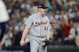 Detroit Tigers pitcher Keider Montero reacts after Seattle Mariners first baseman Josh Naylor's out for the third out of the 11th inning in Game 5 of baseball's American League Division Series Friday, Oct. 10, 2025, in Seattle. (AP Photo/Lindsey Wasson)