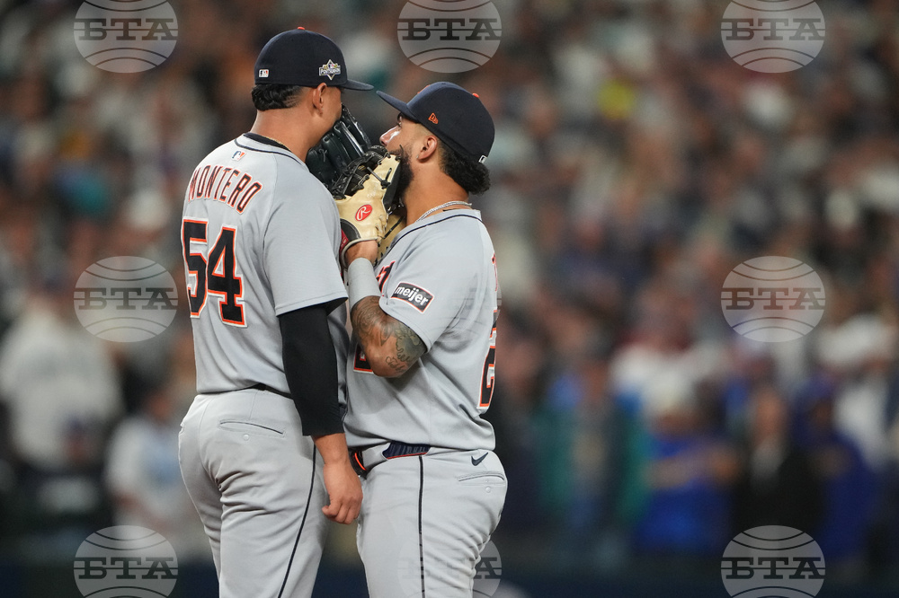 Detroit Tigers pitcher Keider Montero (54) talks with Detroit Tigers second baseman Gleyber Torres at the top of the 11th inning in Game 5 of baseball's American League Division Series against the Seattle Mariners, Friday, Oct. 10, 2025, in Seattle. (AP Photo/Lindsey Wasson)
