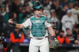 Seattle Mariners catcher Cal Raleigh reacts after tagging out Detroit Tigers third baseman Zach McKinstry at home plate during the 12th inning in Game 5 of baseball's American League Division Series Friday, Oct. 10, 2025, in Seattle. (AP Photo/Lindsey Wasson)