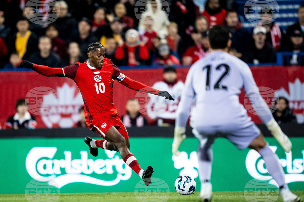 Canada's Jonathan David (10) shoots on-net while Australia goalkeeper Paul Izzo (12) defends during first-half international friendly soccer match action in Montreal, Friday, Oct. 10, 2025. (Christopher Katsarov/The Canadian Press via AP)
