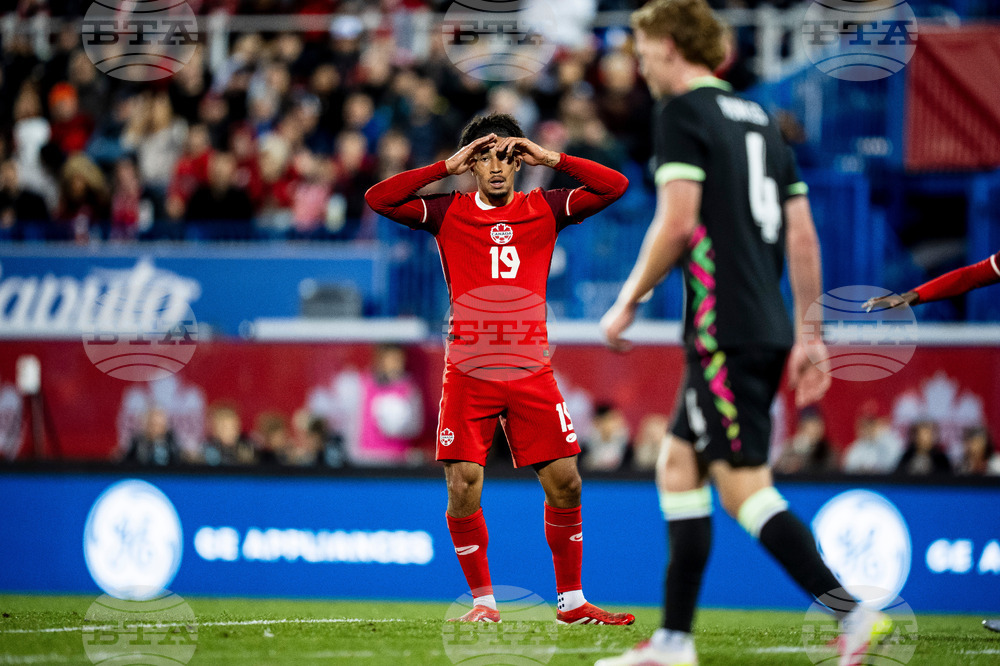 Canada's Nathan Saliba (19) reacts during first-half international friendly soccer match action against Australia in Montreal, Friday, Oct. 10, 2025. (Christopher Katsarov/The Canadian Press via AP)