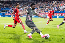 Canada's Tajon Buchanan (17) moves past Australia's Kye Rowles (4) during first-half international friendly soccer match action in Montreal, Friday, Oct. 10, 2025. (Christopher Katsarov/The Canadian Press via AP)