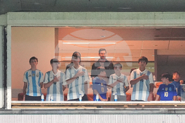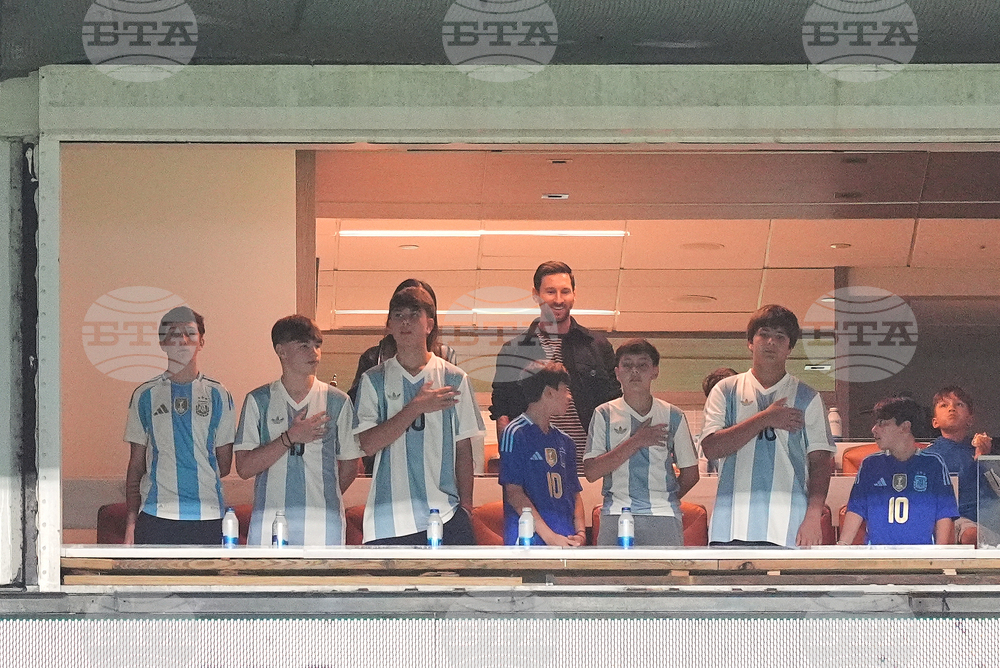 Argentina forward Lionel Messi, center top, watches from a box with family and friends at the start of an international friendly soccer match between Venezuela and Argentina, Wednesday, Oct. 8, 2025, in Miami Gardens, Fla. (AP Photo/Rebecca Blackwell)