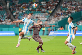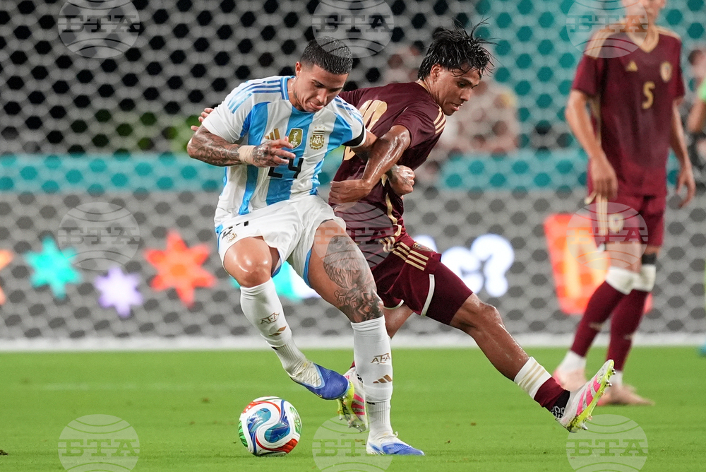 Argentina midfielder Enzo Fernandez (24) and Venezuela midfielder Telasco Segovia (10) vie for a ball during the first half of an international friendly soccer match, Wednesday, Oct. 8, 2025, in Miami Gardens, Fla. (AP Photo/Rebecca Blackwell)