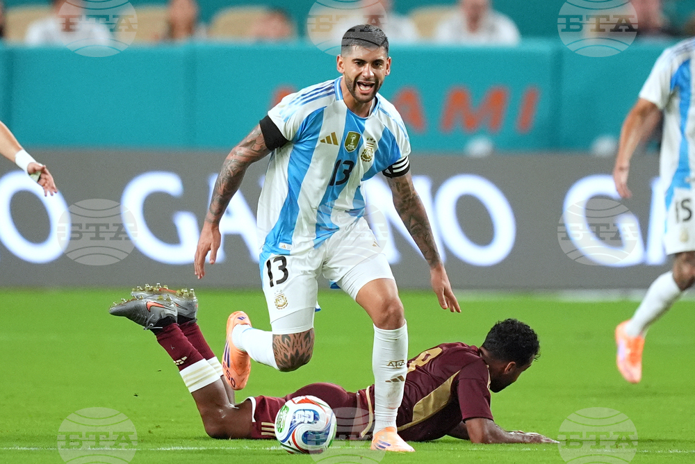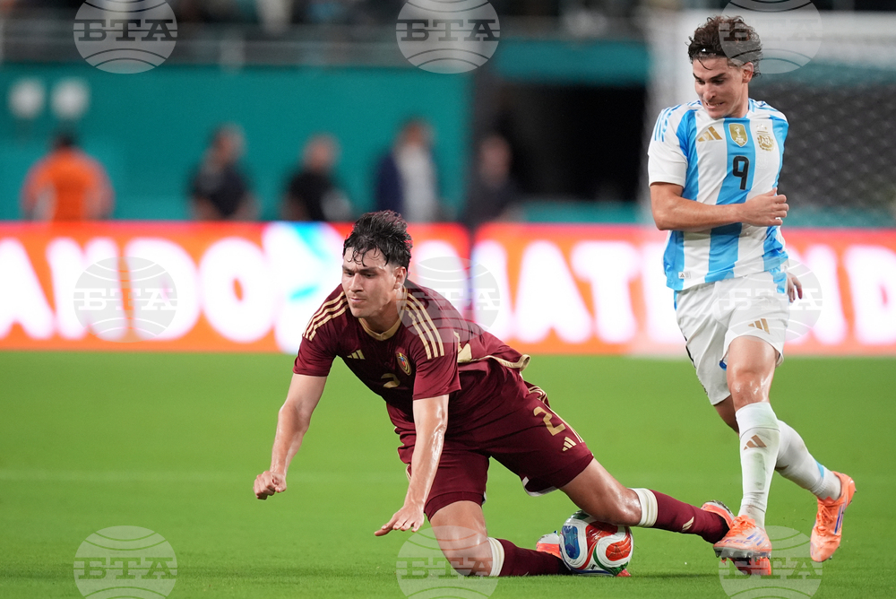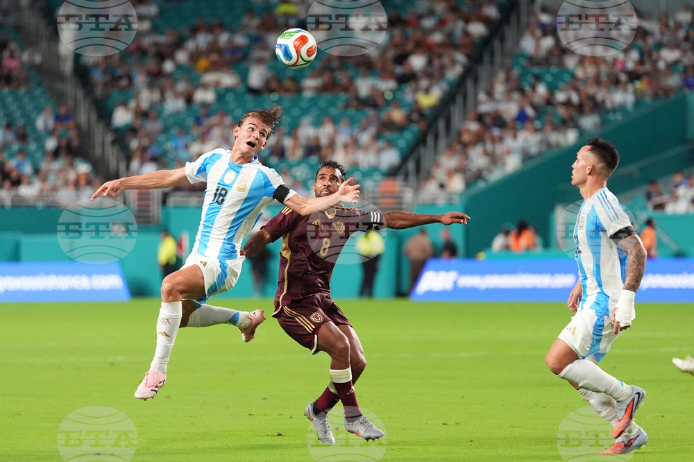 Venezuela midfielder Cristian Casseres Jr., right, snags a ball past Argentina midfielder Nicolas Paz as Venezuela midfielder Wikelman Carmona (18) looks on during the second half of an international friendly soccer match, Wednesday, Oct. 8, 2025, in Miami Gardens, Fla. (AP Photo/Rebecca Blackwell)
