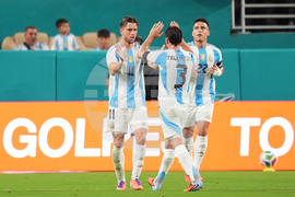 Argentina midfielder Giovanni Lo Celso (11) celebrates scoring his side's first goal with teammates defender Nicolas Tagliafico (3) and forward Lautaro Martinez (22) during the first half of an international friendly soccer match, Wednesday, Oct. 8, 2025, in Miami Gardens, Fla. (AP Photo/Rebecca Blackwell)