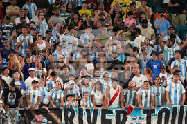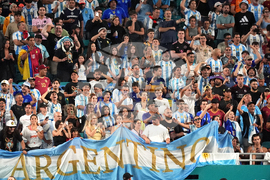 Argentina fans watch during the first half of an international friendly soccer match against Venezuela, Wednesday, Oct. 8, 2025, in Miami Gardens, Fla. (AP Photo/Rebecca Blackwell)