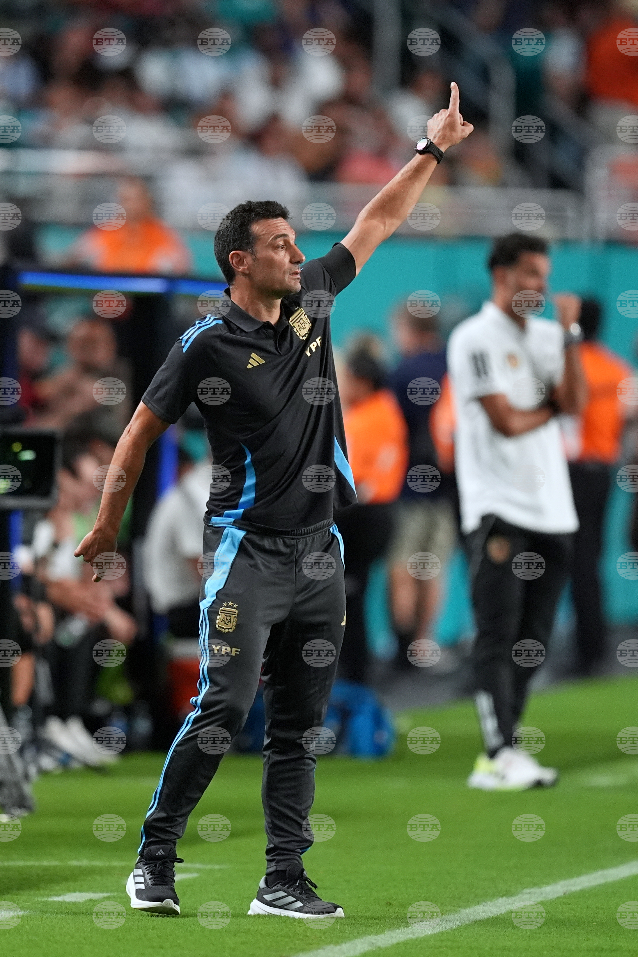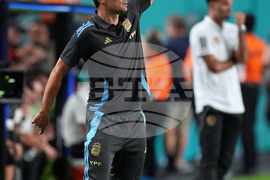 Argentina head coach Lionel Scaloni gestures on the sideline during the second half of an international friendly soccer match against Venezuela, Wednesday, Oct. 8, 2025, in Miami Gardens, Fla. (AP Photo/Rebecca Blackwell)