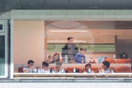 Argentina forward Lionel Messi, center top, watches from a box with his wife Antonela Roccuzzo, top left, their sons, and other friends at the start of an international friendly soccer match between Venezuela and Argentina, Wednesday, Oct. 8, 2025, in Miami Gardens, Fla. (AP Photo/Rebecca Blackwell)
