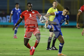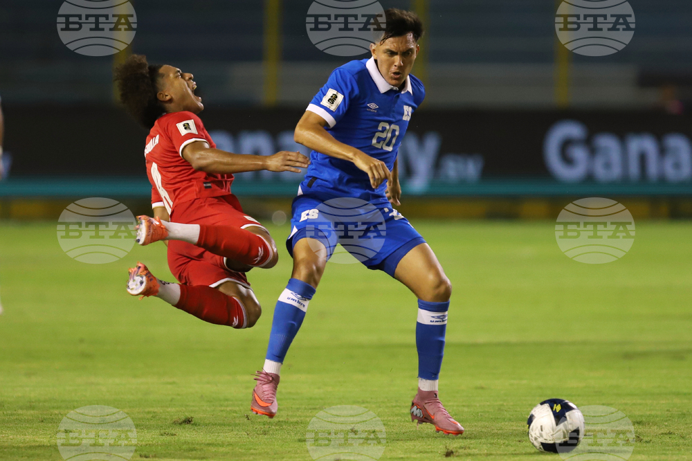 El Salvador's Bryan Gil, left, and Panama's Jiovany Ramos vie for the ball during a World Cup 2026 qualifying soccer match at Cuscatlan stadium in San Salvador, El Salvador, Friday, Oct. 10, 2025. (AP Photo/Salvador Melendez)