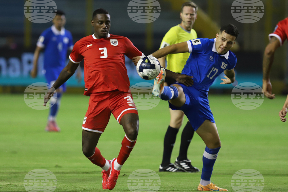 Panama's Jose Cordoba, left, and El Salvador's Styven Vasquez compete for the ball during a World Cup 2026 qualifying soccer match at Cuscatlan stadium in San Salvador, El Salvador, Friday, Oct. 10, 2025. (AP Photo/Salvador Melendez)