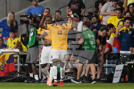 CORRECTS PLAYER - Ecuador's Enner Valencia (13) celebrates a goal against the United States during the first half of an international friendly soccer match in Austin, Texas, Friday, Oct. 10, 2025. (AP Photo/Eric Gay)