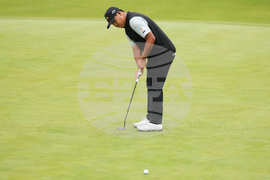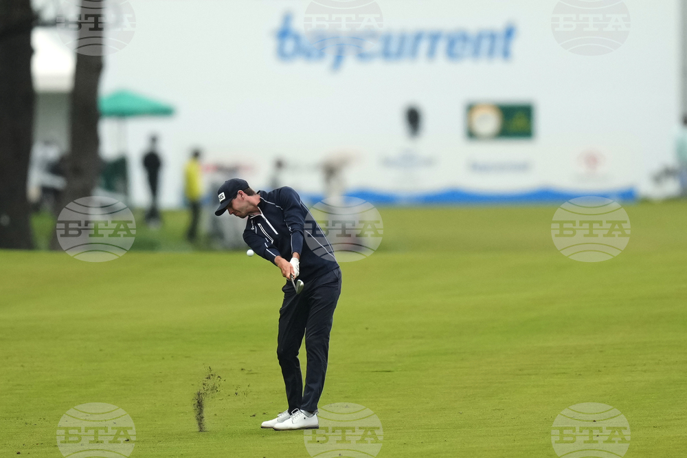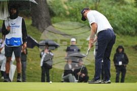 Rico Hoey, of the Philippines, makes a putter shot on the first hole during the third round of the Baycurrent Classic golf tournament at the Yokohama Country Club in Yokohama, near Tokyo, Saturday, Oct. 11, 2025. (AP Photo/Hiro Komae)
