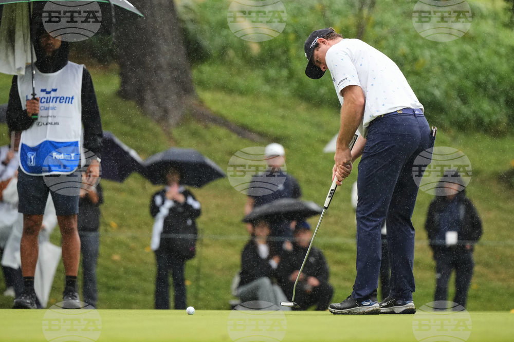 Max Greyserman, of the U.S., makes a putter shot on the second hole during the third round of the Baycurrent Classic golf tournament at the Yokohama Country Club in Yokohama, near Tokyo, Saturday, Oct. 11, 2025. (AP Photo/Hiro Komae)