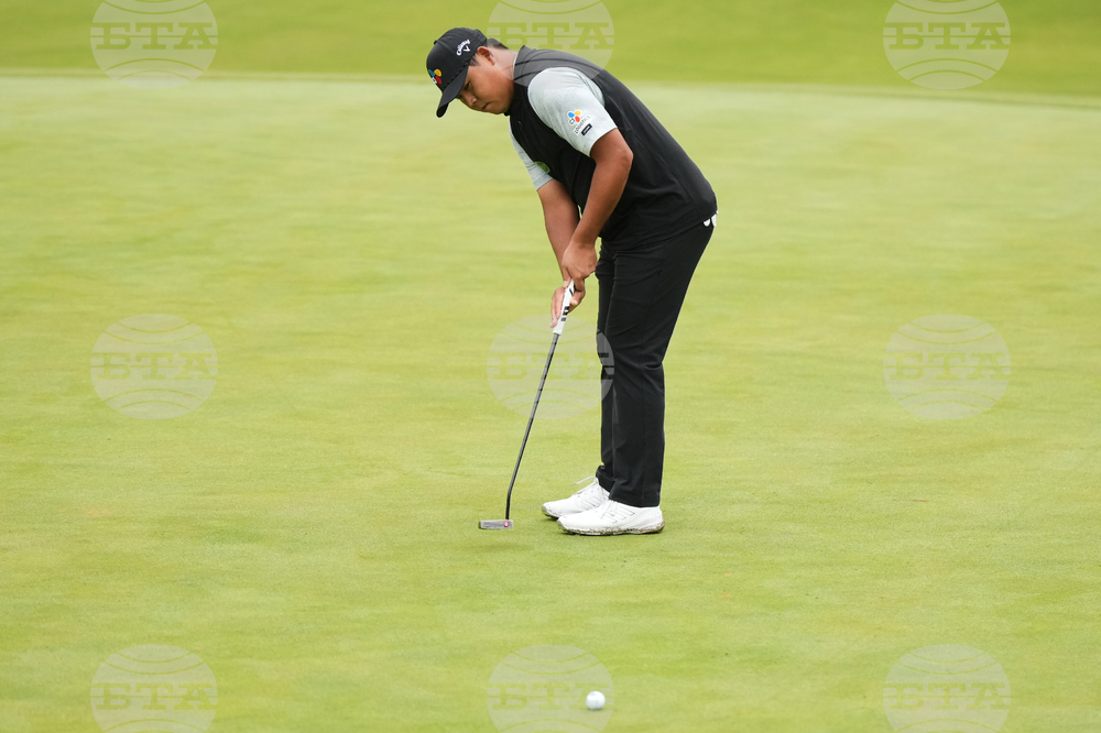 Kim Si-woo, of South Korea, makes a putter shot on the first hole during the third round of the Baycurrent Classic golf tournament at the Yokohama Country Club in Yokohama, near Tokyo, Saturday, Oct. 11, 2025. (AP Photo/Hiro Komae)