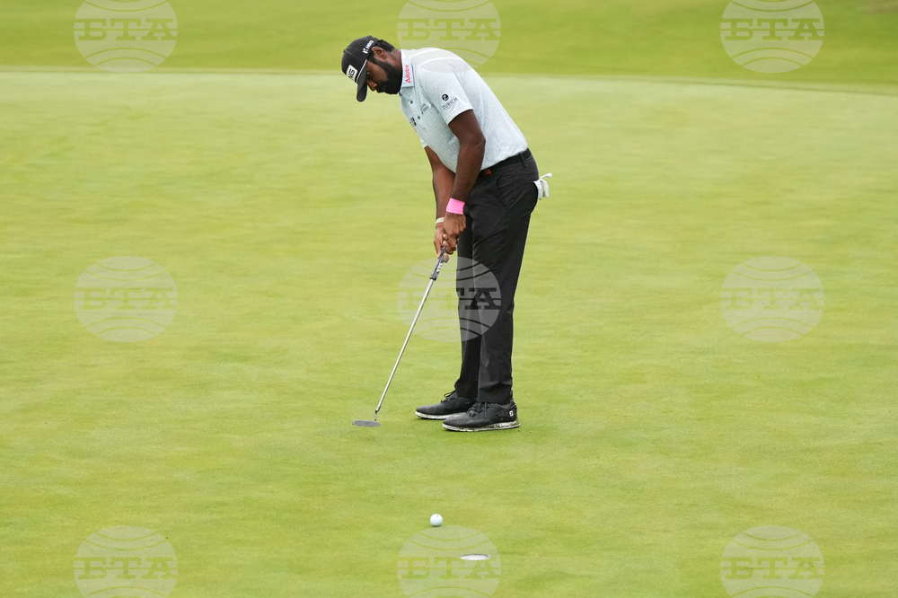 Sahith Theegala, of the U.S., makes a putter shot on the first hole during the third round of the Baycurrent Classic golf tournament at the Yokohama Country Club in Yokohama, near Tokyo, Saturday, Oct. 11, 2025. (AP Photo/Hiro Komae)