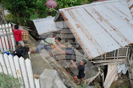 Residents bring out belongings from their earthquake damaged home as they evacuate to safer grounds at Manay town, Davao Oriental province, southern Philippines Saturday, Oct. 11, 2025. (AP Photo/Jeoffrey Maitem)