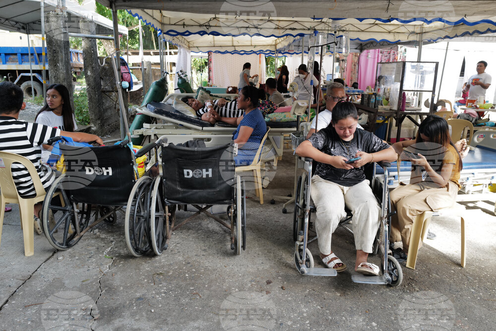 Patients and some family members stay outside a hospital after the earthquake-hit Manay town, Davao Oriental province, southern Philippines, Saturday, Oct. 11, 2025. (AP Photo/Jeoffrey Maitem)